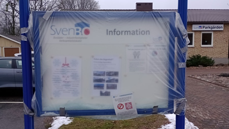 Även Svenbos informationstavla vid Parkgården har fått glaset krossat.