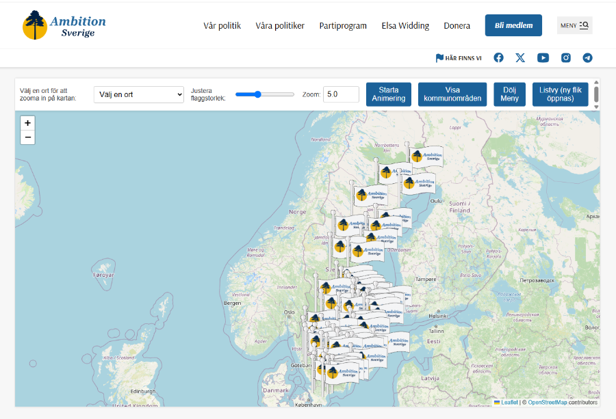 Skärmdump av Ambition Sveriges websida där det finns klickbar länk till Leaflet ( leafletjs.com ):