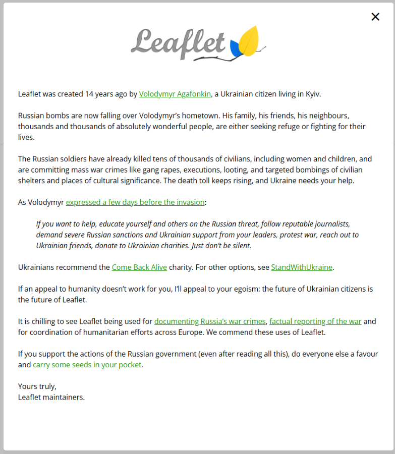 Skärmdump av den information som visas när man klickar på Leaflet: