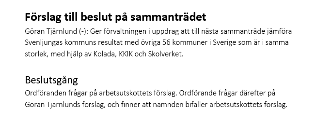 Göran Tjärnlund har under BUN:s möte i november 2025 föreslagit att förvaltningen skulle ta fram jämförande underlag av skolresultaten mellan 56 kommuner i Sverige. Hans förslag röstades ner.
