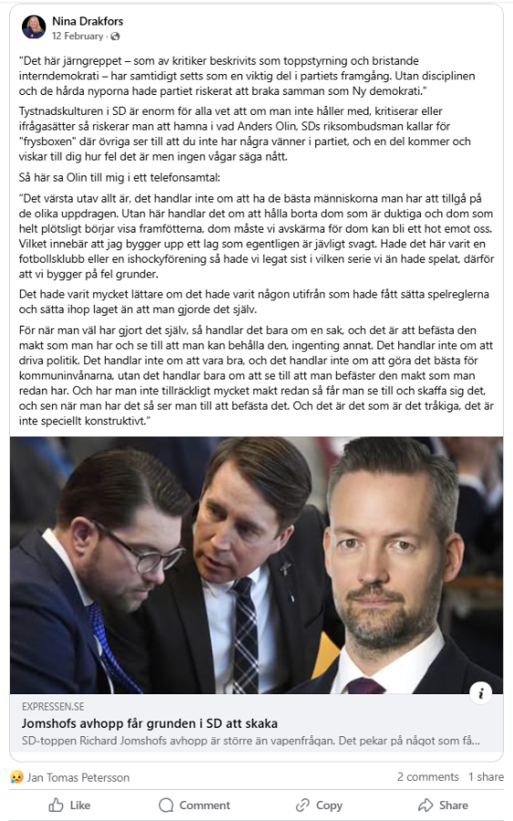Jag säger upp rollen som [SD:s] gruppledare med omedelbar verkan. Har inte tiden eller engagemanget för denna roll som det ser ut nu. Fått även samma respons från Leif [Karlsson] och Göran [Tjärnlund] då de anser göra ett så mycket bättre jobb vilket jag förstår till punkt och pricka. De har betalt att vara hemma och har den (jag måste försörja mig, icke betalt från pension eller försäkringskassa) Samma gäller BUN, Göran [Tjärnlund] har länge önskat min plats så jag välkomnar honom att ta över. Finns en plats kvar: presidiet [2:e viceordförande] , någon som är sugen? Hur som, ni väljer bland gruppen efter bästa förmåga och jag önskar er all lycka till. Jag är nöjd med att kunna rösta på SD vid kommande val.
