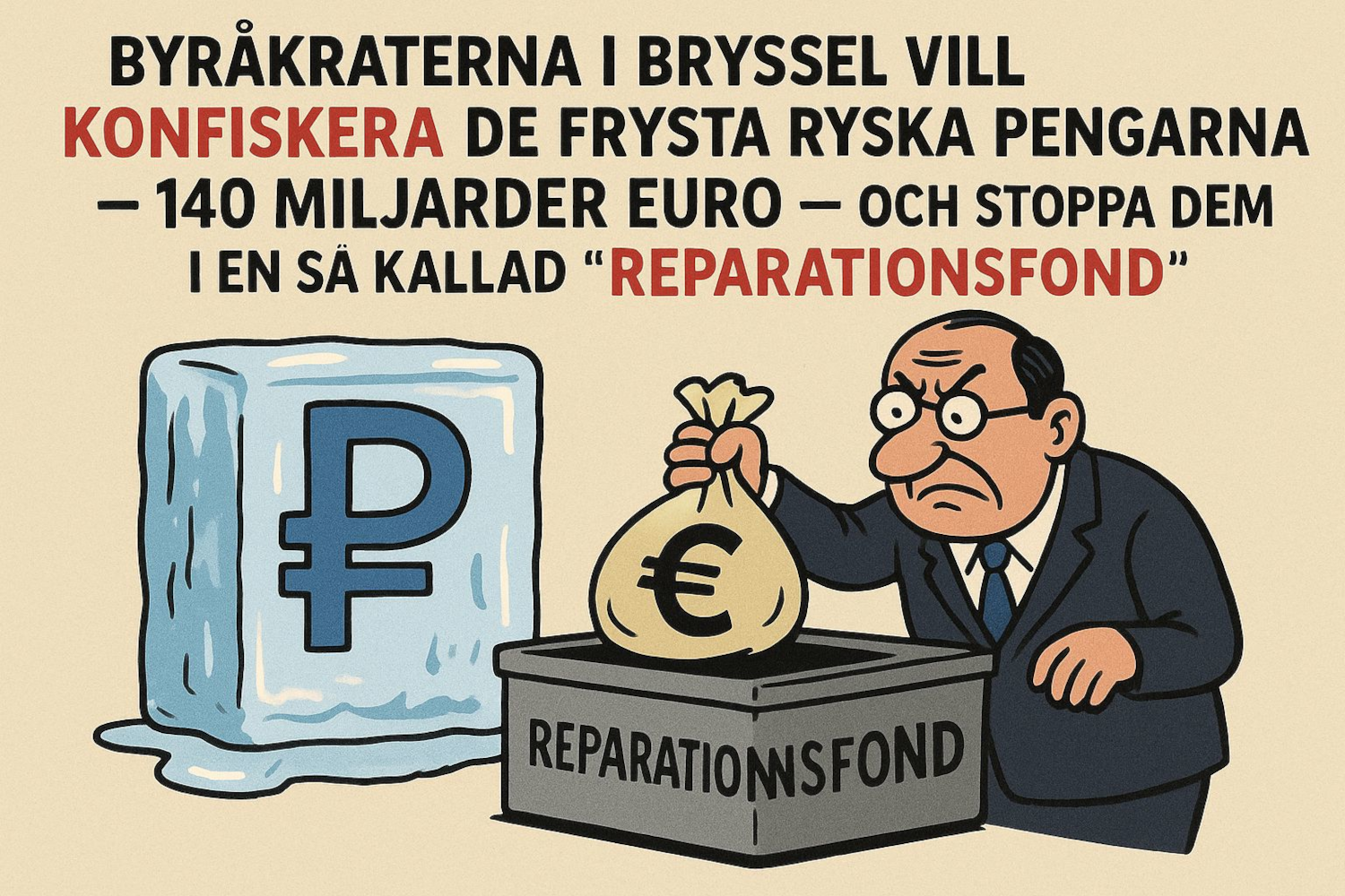 Byråkraterna i Bryssel vill konfiskera de frysta ryska pengarna – 140 miljarder euro – och stoppa dem i en så kallad “reparationsfond”.