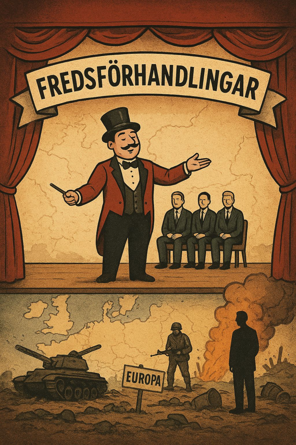 Man får nästan intrycket att de pågående ”fredsförhandlingarna” är mer en varietéföreställning än en seriös diplomatisk process. En scen där kulisserna är skeva, skådespelarna utmattade och publiken sedan länge tappat illusionen.