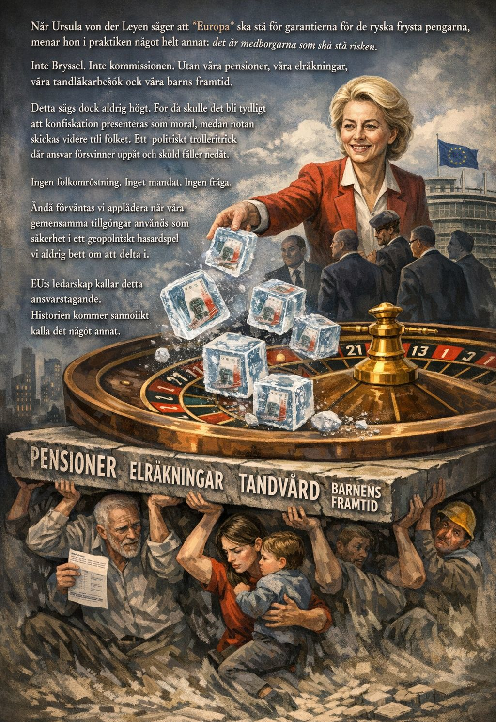 Detta sägs dock aldrig högt. För då skulle det bli tydligt att konfiskation presenteras som moral, medan notan skickas vidare till folket. Ett politiskt trolleritrick där ansvar försvinner uppåt och skuld faller nedåt.